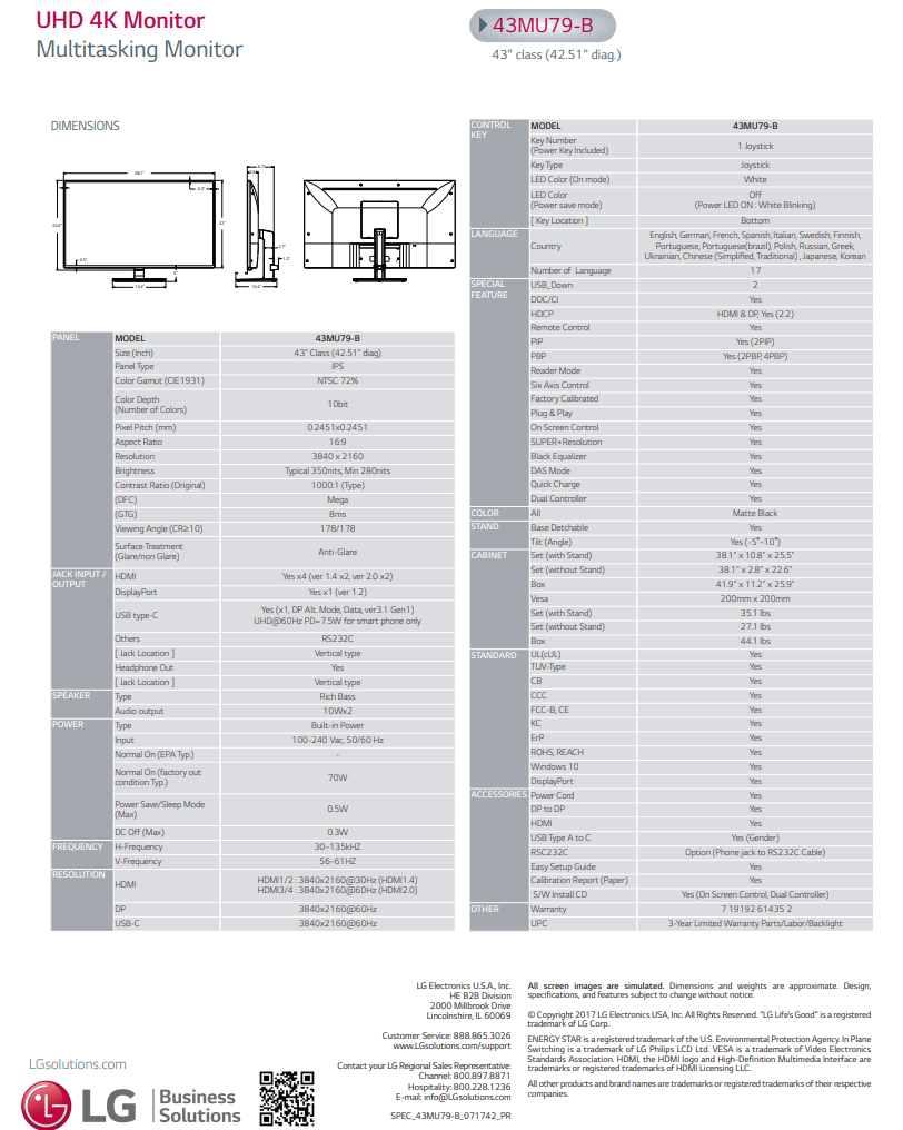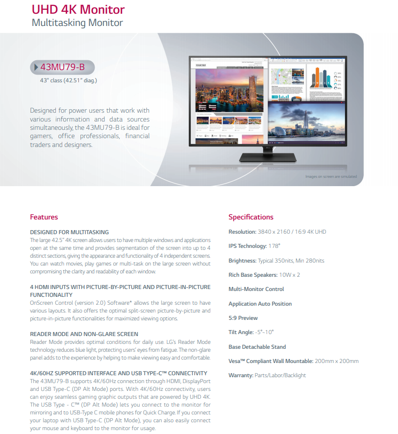 LG 43" Class 4K UHD IPS LED Monitor 3840x2160 43MU79